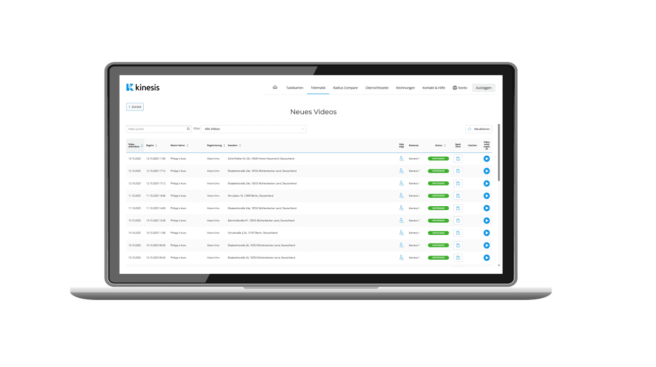 - Zugriff auf das Filmmaterial: Aufgezeichnete Videos dieser Ereignisse können einfach über die Bereiche „Ereignisvideos“ oder „Fahrtenverlauf“ auf Kinesis angesehen und abgerufen werden.